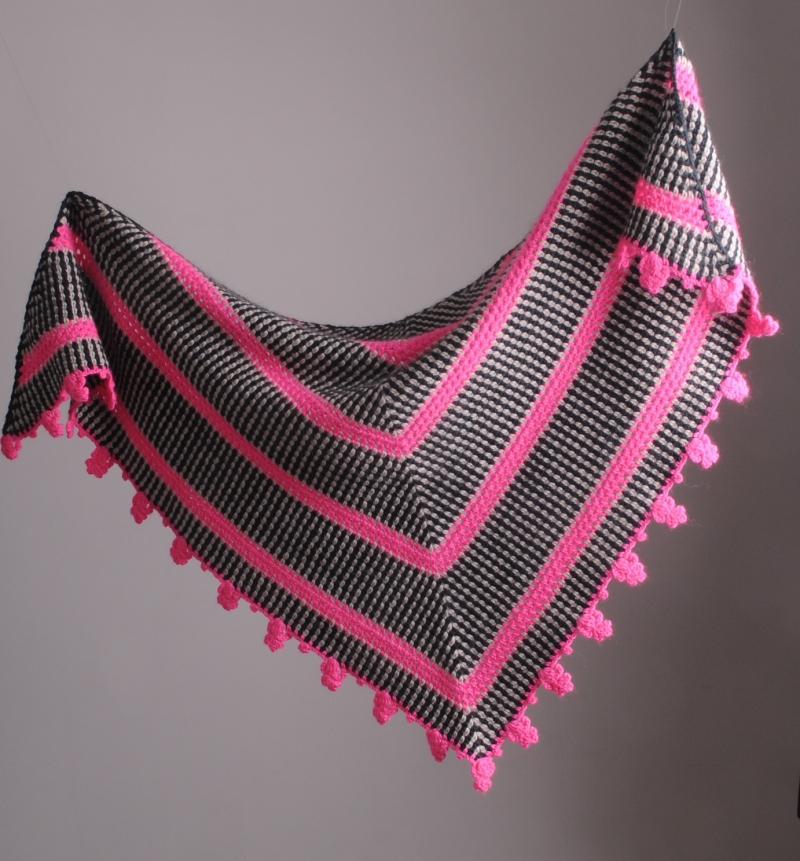 This is a super easy shawl to make. The only issue really is the ends, you change colour on every row! However, if you crochet them in as you work then this isn't a huge problem. Linen stitch is a lovely stitch to use, the pattern it makes changes depending on how you stripe the yarn, if, like in this shawl you change colour on every row you get vertical stripes. To give it a pop of colour we have added some Pink (Bubblegum) stripes and also used it in the flower edging. If you would like something a bit simpler a picot edging would look great too.