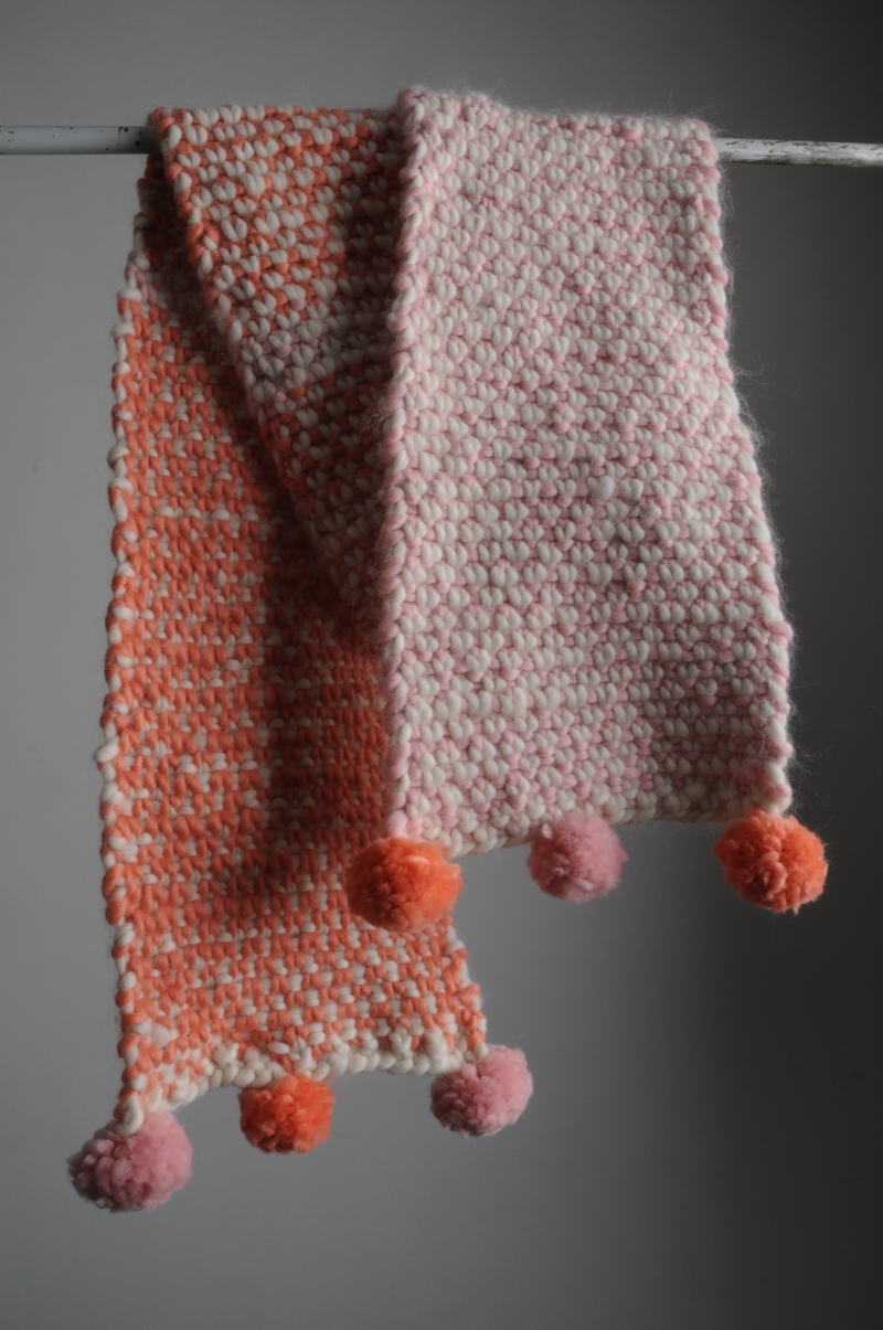 Super simple, but a little bit complicated to describe and explain! I’ve wanted to be able to work colour and texture into a design for some time and could never quite get it to work, other than using brioche, which I admit is lovely, but isn’t quite what I was after. I’m really pleased with this though which is extremely textured! The way it is made means that you almost get a woven-like fabric – almost not knitting at all! It is worked using the ‘double knitting’ technique. Usually used in a rib to give completely reversed stitches on the two sides of your work, here I done it in moss (seed) stitch to create really distinct stitch shapes and textures. The scarf is reversible too which I think is a must for any scarf really. I’ve worked this using two separate contrast colours, you could of course use the same contrast throughout in which case you’ll need 2 skeins of the contrast.
